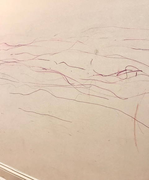 自宅に戻ると廊下の壁に壮大なアート作品を発見。壁一面に紫色の線が幾重にも描かれている。