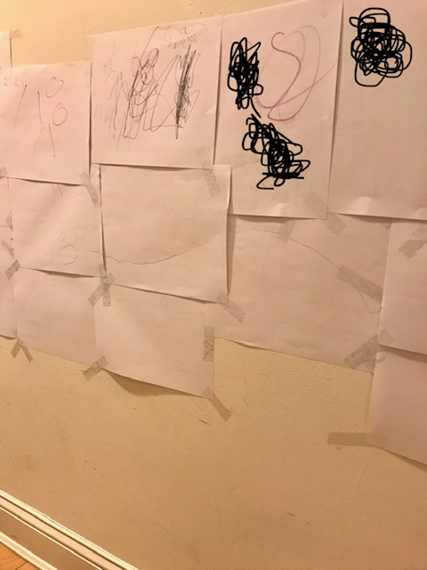 その後、壁画の壁は、娘が紙をテープでぺたぺた貼り付け、素敵な第二のアート作品へ生まれ変わった。ありがとう。